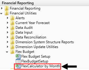 In the Bud Admin task pane, in the Financial Reportingsection, click Financial Utilities > Flex Budget, and double-click FlexCalculator by Month.