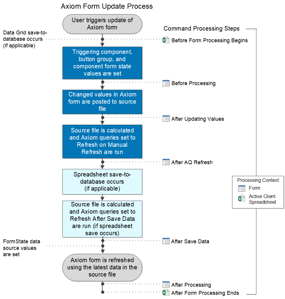 The Command Processing Steps only apply when the update is triggered by a component that has one or more defined commands, such as a Button component or a KPI Panel component. The processing steps indicate when the command will be executed during the process. When using an Axiom form as a dialog in the Excel Client or the Windows Client, you can also indicate where the command will be executed (the processing context)—either on the form itself, or on the active client spreadsheet.