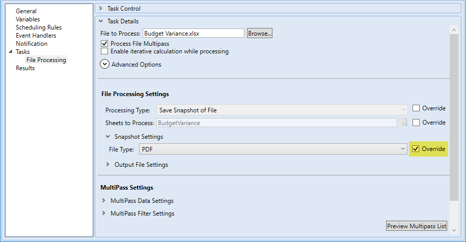 6. If needed, you can override certain file processing settings defined in the file (including batch variables), so that the override value is used when the file is processed by Scheduler. In order to override a setting, select the Override check box for that setting and then enter the override value into the field.