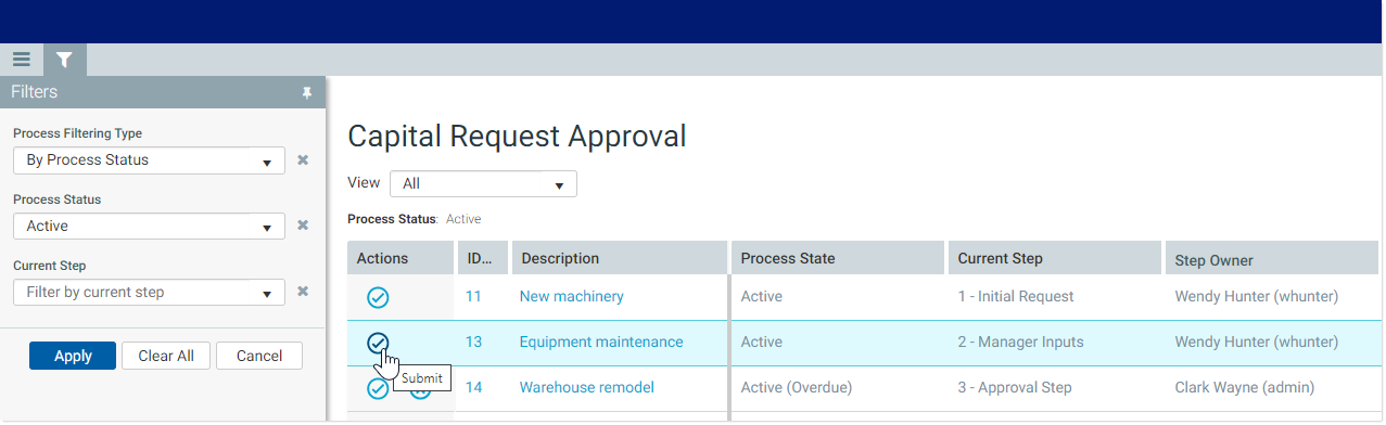 2. Filter or search the page as needed to locate the plan file for which you want to complete the step. For more information on the features available on this page, see Managing your process tasks.