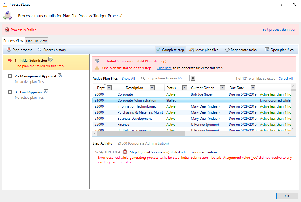 While the plan file is stalled, it cannot progress in the process. To see more information about what caused the plan file to stall, go to the Process Status dialog and select the applicable step, then select the affected plan file in the grid. The specific error is listed in the Step Activity details for the plan file, as well as in the Details column of the grid. A notification about the error is also sent to the process owner.