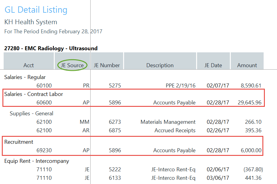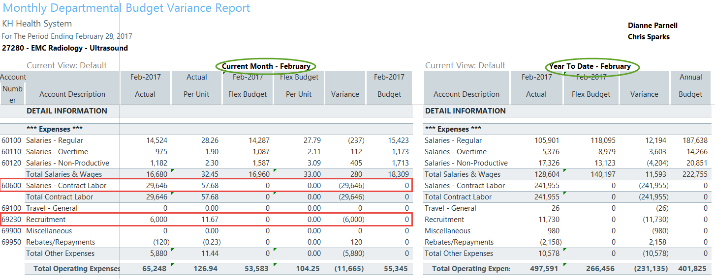 Review the Summary Level information, then look to the detail for further explanation regarding variances. Determining the account numbers with variances will provide the link to the detailed information on the AP, AR, MM, etc. reports that support the expense. As in our example above, Salaries and Other Expenses resulted in a Red Flag Variance, specifically within accounts 60600 Salaries-Contract Labor and 69230-Recruitment.