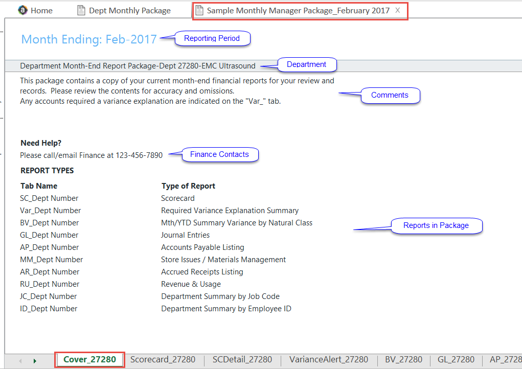 The Cover tab is the first sheet that displays within the Dept Monthly Package. It is also included as part of the Manager’s month-end distributed package.