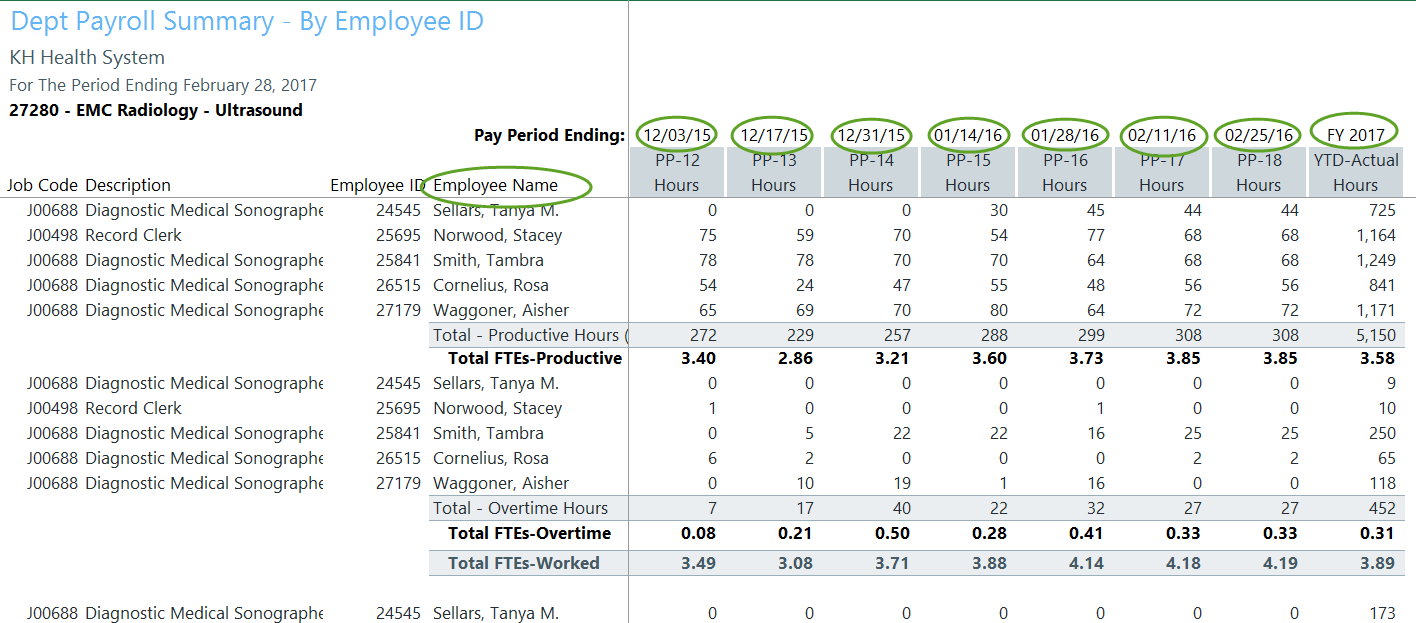The Pay by Employee ID (EmpID) report contains Hour and FTE information by individual Employee , including recent individual pay periods and year-to-date.