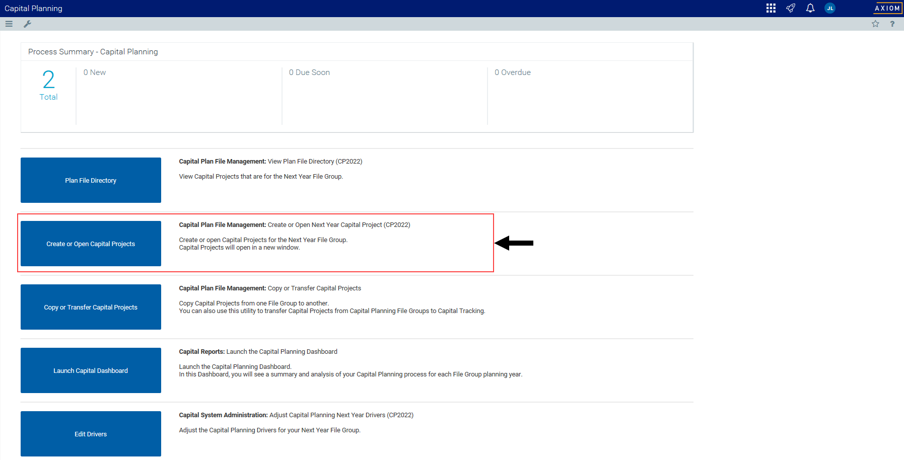 From the Axiom Capital Planning home page, click Create or Open Capital Projects.