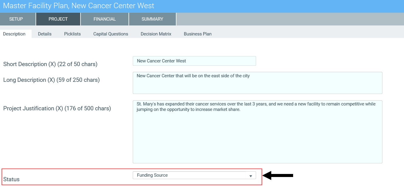In the Project tab > Description tab of the project plan file, the Status field will display "Funding Source" to inform the project requestor the status of the project.