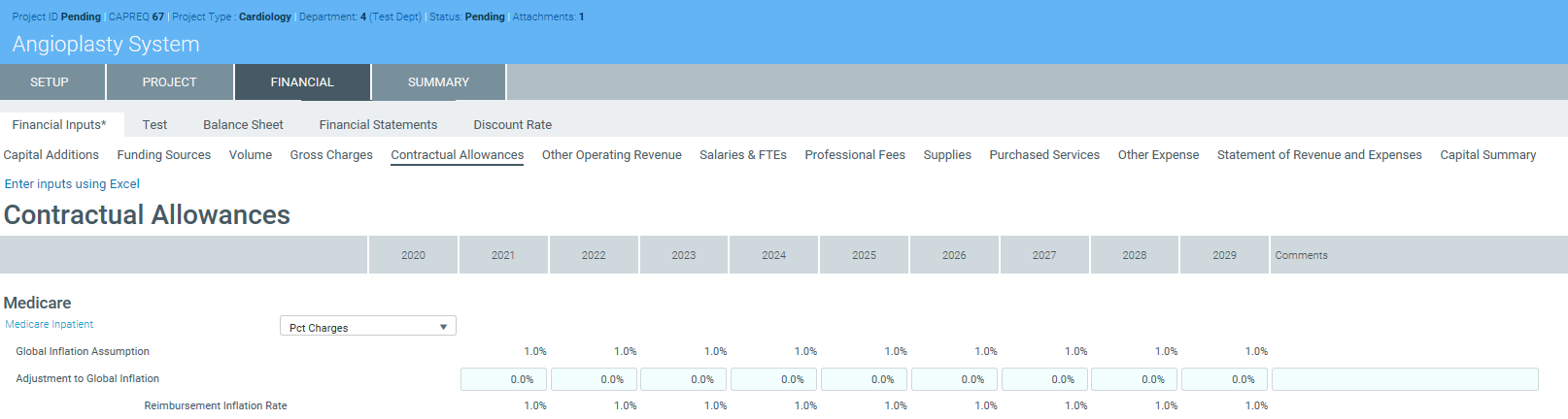 NOTE: The system allows you to make a copy of the Financial Inputs tab and rename it. This allows you to model different scenarios in your project. As a result, you may see several versions of the Financial Inputs tab with different names in the project plan.