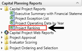From the Cap Plan Admin task pane, in the Capital Planning Reports section, click Capital Project Reports, and double-click Project Ranking.