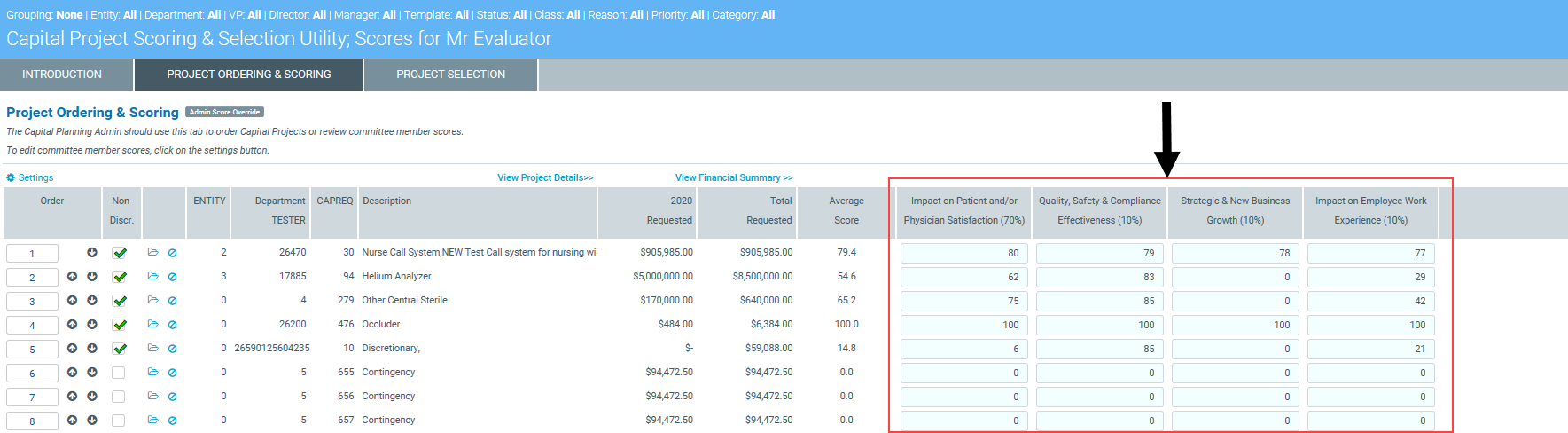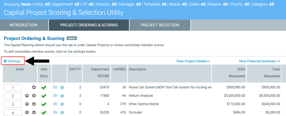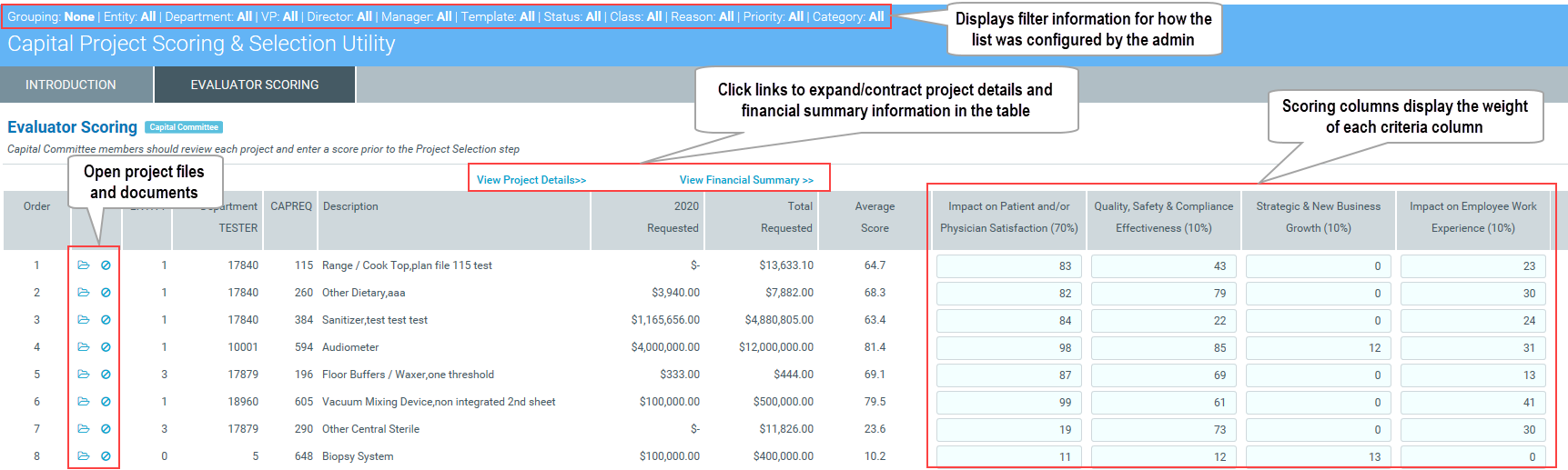 If you are a Capital Planning Administrator, you can use the Capital Project Scoring and Selection utility to ensure that committee members have scored projects as well as modify scores for members, for example, if they enter an incorrect score.