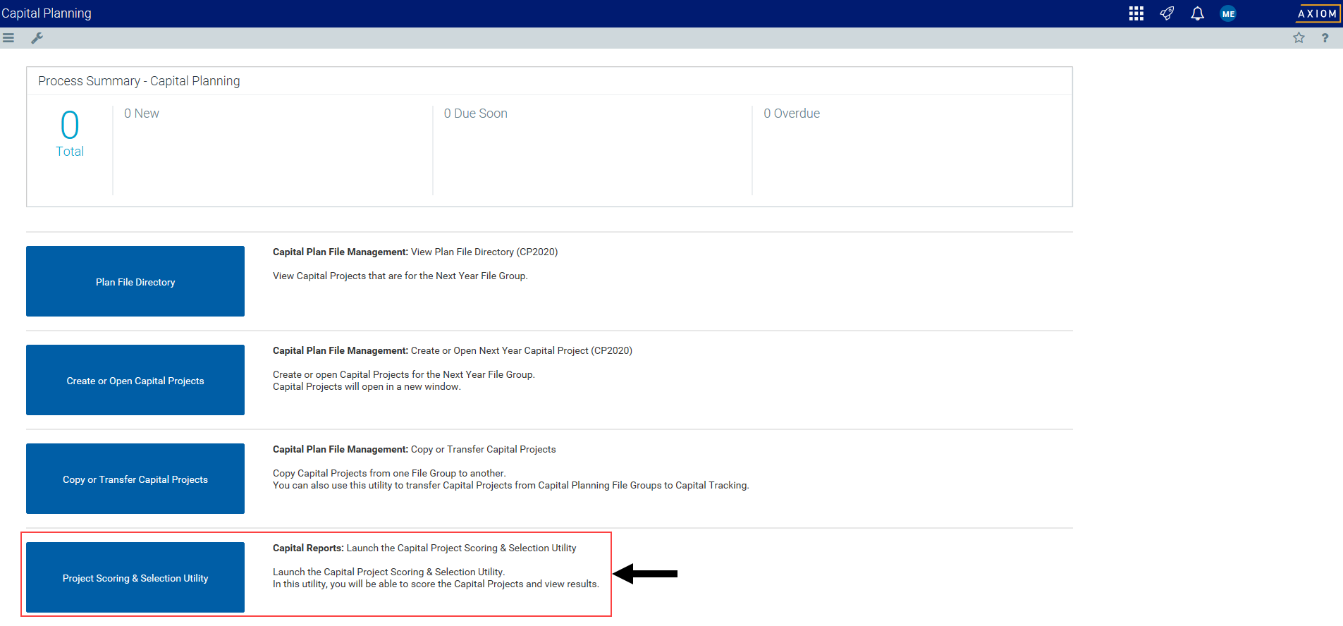 From the Axiom Capital Planning home page, click Project Scoring & Selection Utility.