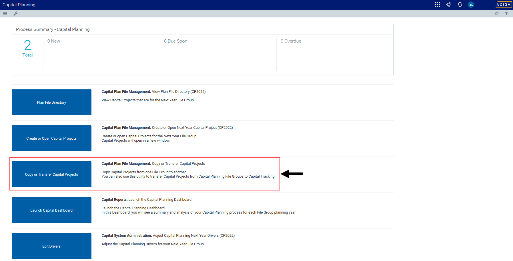 From the Axiom Capital Planning home page, click Copy or Transfer Capital Projects.