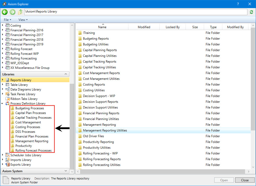 In the Axiom Explorer dialog, right-click the Process Definition Library (or a file group Process Definition folder), and click New > Process Definition.