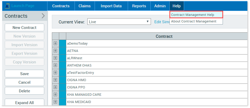 Contextual help – For selected Axiom Contract Management main pages such as the Contracts page, Drill-Down Reports page, View a Claim, and others, accessing the help from these pages opens the online help topic related to that feature.