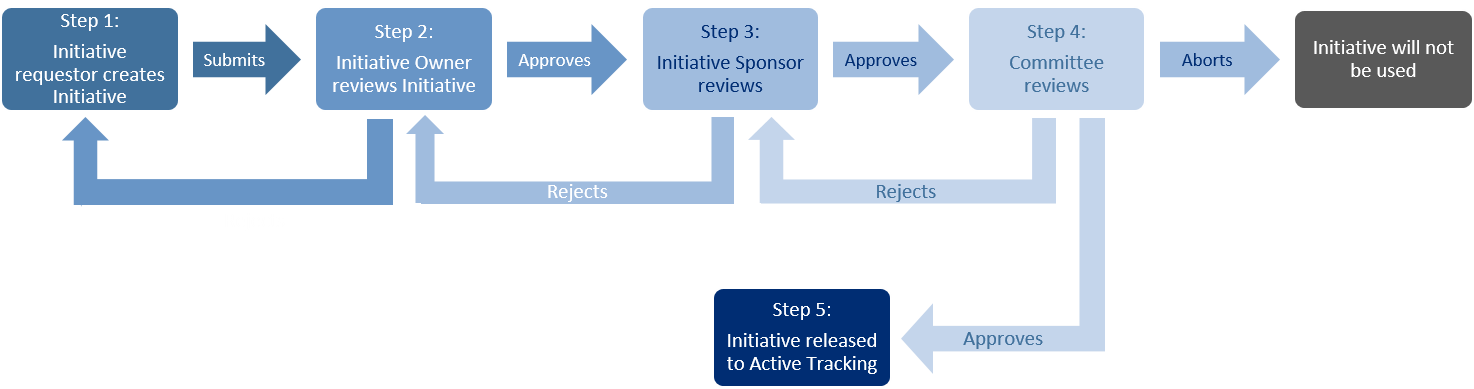 Step 4: Committee Approval. Only one Initiative approver A user who can review and approve Initiatives at the Committee Approval stage of the Initiative creation approval process. Approvers must be given the Initiative Approver role by the system administrator. in the committee of Initiative approvers needs to approve or reject the Initiative to move it to the next step. If approved, the Initiative moves to the Active Tracking stage. If rejected, the Initiative moves back to the sponsor. If the approver decides that the Initiative is not going to be used, they can terminate it.