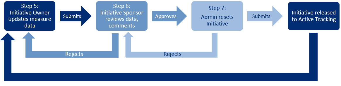 Step 6: Active Review. The Initiative sponsor The user who authorizes Initiatives, including those that are proposed by someone else and those that they propose. The Initiative sponsor does not create Initiatives but instead provides authority for work to be done on Initiatives. The sponsor also reviews and approves Initiatives during various stages in Initiative approval processes. reviews the Initiative measure data and milestone status, comments and then either approves or rejects the update. If the update is rejected, the Initiative reverts to the Active Tracking stage so that the owner can fix what is wrong and then resubmit it to the sponsor for review. If the sponsor approves the update, the Initiative waits in the pending reset queue for the system administrator.