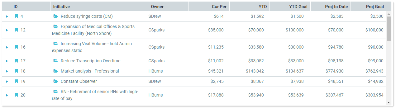 The report table displays a list of all filtered Initiatives, and displays the following measure data for each Initiative listed: