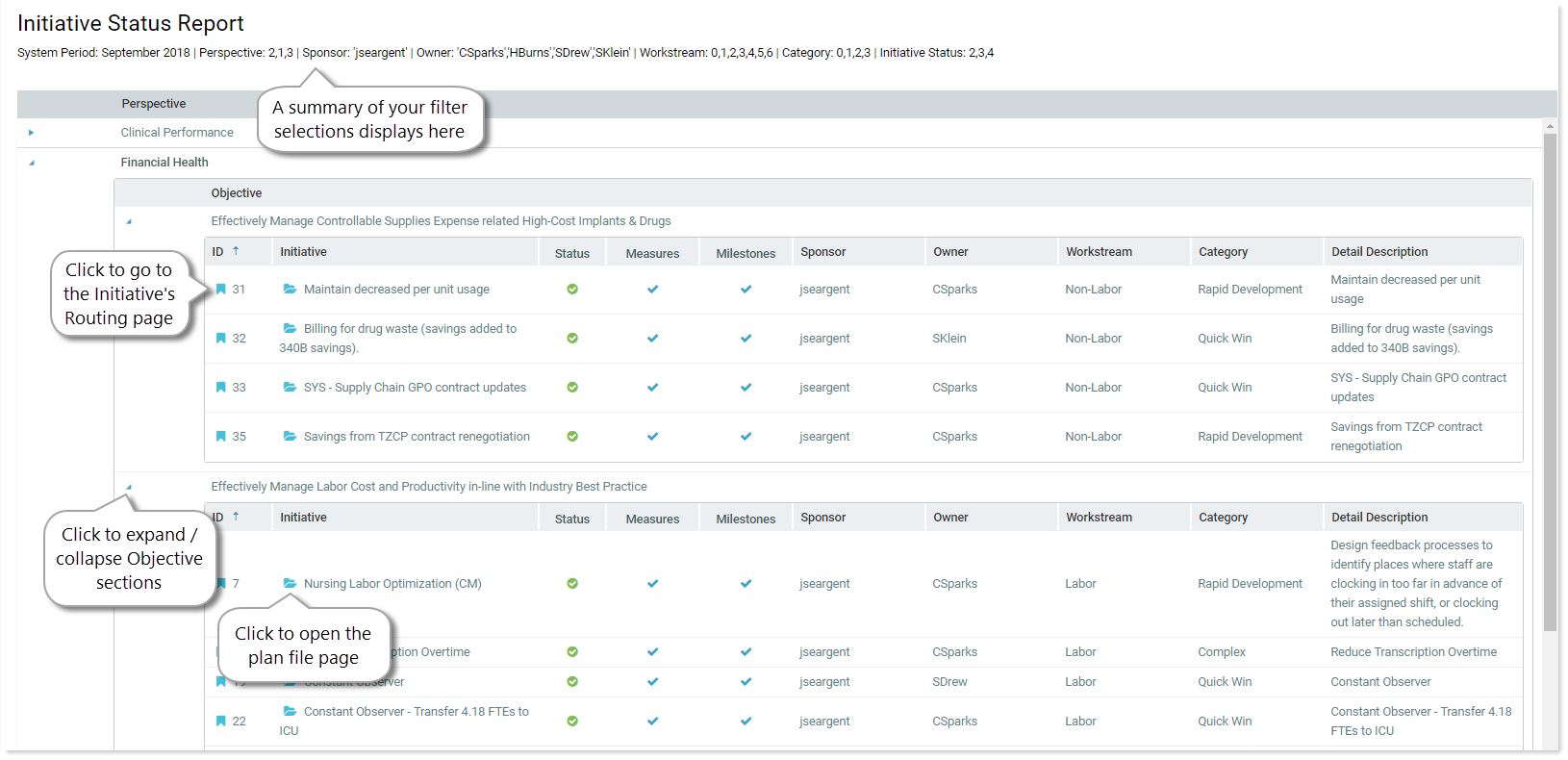 ). - Filter the report to show only the Initiatives you want to see, or the Initiative data you want to see.