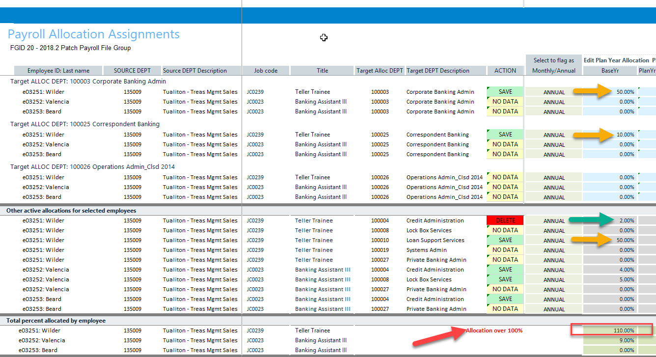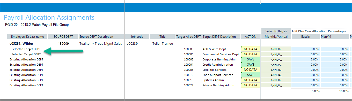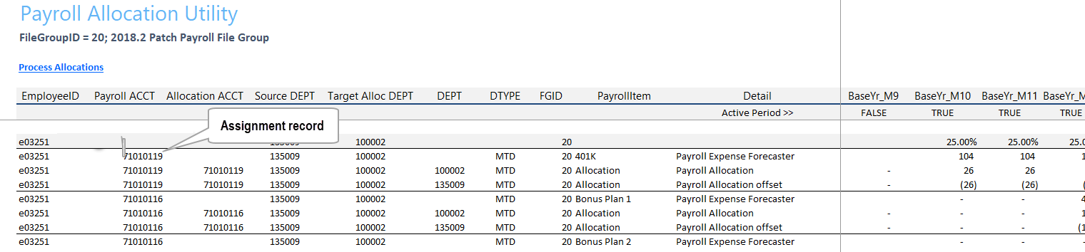 The following example shows the organization of the utility. The first record is an assignment record (as noted) for the employee. It shows the EmployeeID, source and target Alloc Depts, and the allocation percentages from the assignment table in the monthly columns. Variables for the file group’s Base Period and Terminal Year are used to determine which columns are active. In this case, the first column (BaseYR.M9) is not an active period and is ignored.