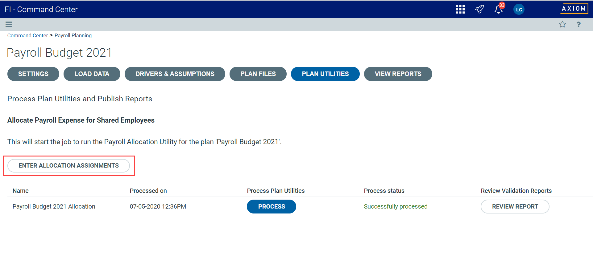 In the Process Plan Utilities column, locate Payroll Budget YYYY Allocation in the list, and click Process in the Process Plan Utilities column.