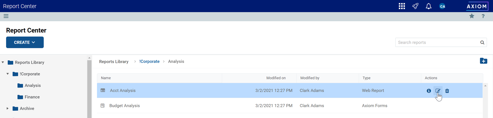 Using the Report Center in the Axiom Web Client, you can create, edit, and delete web reports as needed. Web reports are designed to be intuitive for report builders to create, and easy for end users to consume.