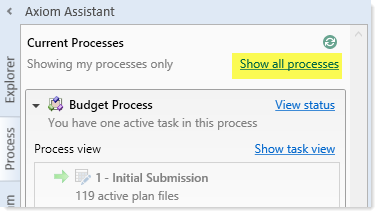 The Process Management feature can be used to manage and track any Axiom-related process. A process is a series of defined steps that represent the tasks to be completed. If you are the assigned owner of a step in a process, then it is your responsibility to perform the necessary task and mark the step as complete by the specified due date. You can do this by using the Process task pane.