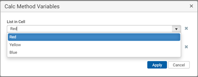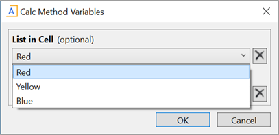 StringList calc method variables prompt users to make a selection from a predefined list. This list is manually defined within the current file—either in the CalcMethodVariables data source itself, or in a range of cells that are then referenced in the data source.