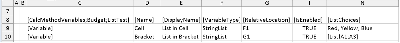 This section explains how to complete a variable row in the CalcMethodVariables data source when defining a StringList variable. Some data source columns do not apply in this case and are not discussed here. If any inapplicable columns are present in the data source, they should be left blank on rows that define StringList variable types. For more information on the CalcMethodVariables data source in general, see Defining calc method variables using a CalcMethodVariables data source.