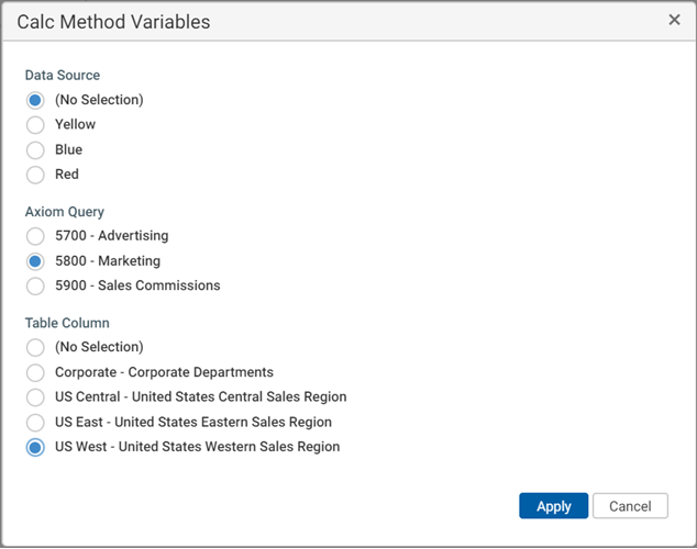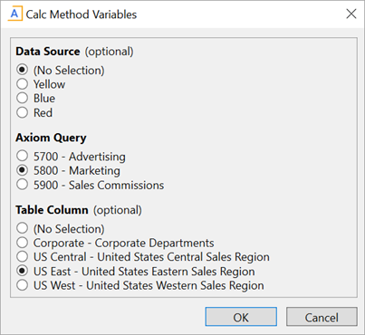 When the RadioButton variable is rendered in the Calc Method Variables dialog, the specified Axiom query is run in memory only (meaning, no values are populated within the sheet where the query is configured). The results of the query are used to generate the list of radio buttons.