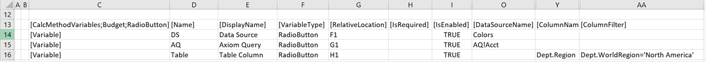 This section explains how to complete a variable row in the CalcMethodVariables data source when defining a RadioButton variable. Some data source columns do not apply in this case and are not discussed here. If any inapplicable columns are present in the data source, they should be left blank on rows that define RadioButton variable types. For more information on the CalcMethodVariables data source in general, see Defining calc method variables using a CalcMethodVariables data source.