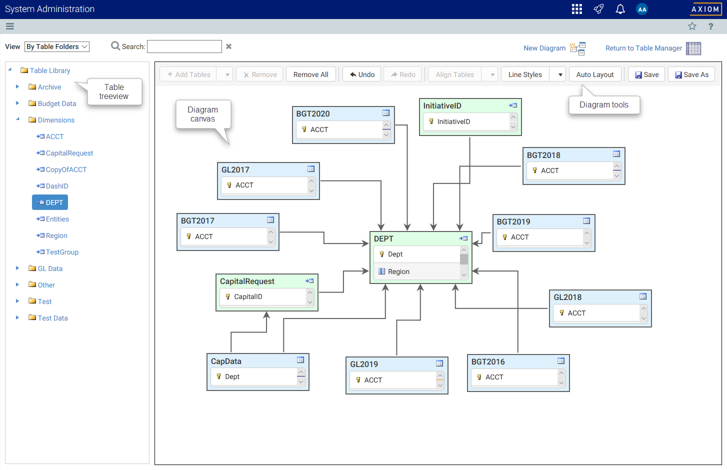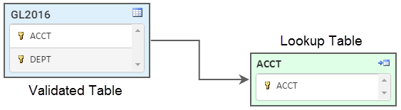 If you want to see which tables use DEPT as a lookup table, then you can click Add Tables > Tables that reference DEPT. This will add tables such as GL2021 and BGT2021 to the diagram, assuming these tables have a Dept column that is validated against