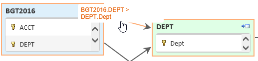 • Hover your cursor over a relationship line to see the names of the two columns that make up the connection. The first column is the validated column and the second column is the lookup column. For example: