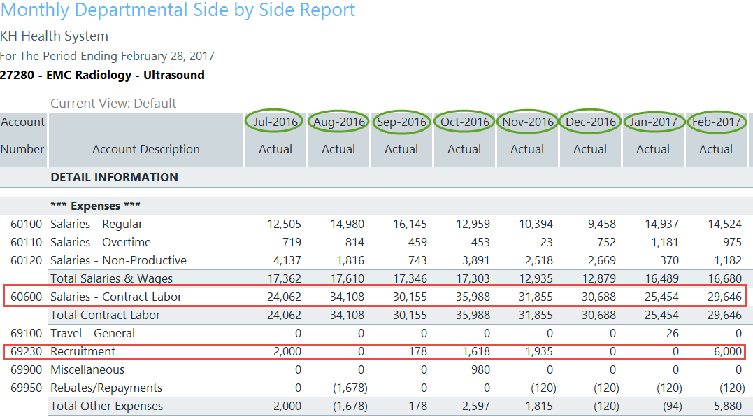 Review the Summary Level information, then look to the detail for further explanation regarding variances. Determining the account numbers with variances will provide the link to the detailed information on the AP, AR, MM, etc. reports that support the expense. As in our example above, Salaries and Other Expenses resulted in a Red Flag Variance, specifically within accounts 60600 Salaries-Contract Labor and 69230-Recruitment.