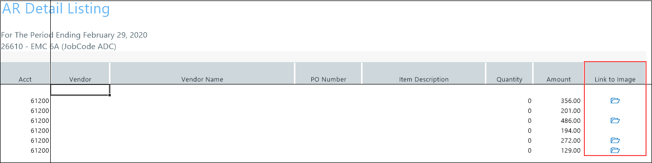 AR transactions may include links to supporting documentation. In the Link to Image column, click the folder to open the document image.