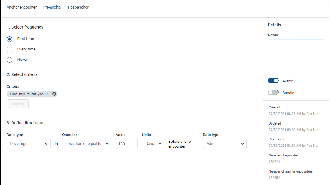• To include only the first pre- or post-anchor encounter related to the anchor encounter, select First time.