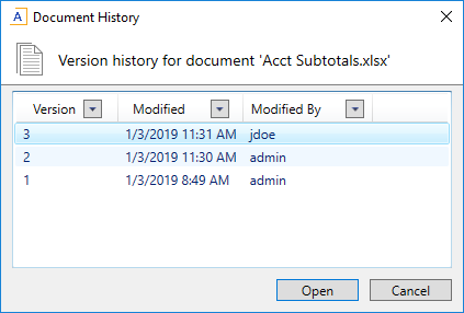 You can view the list of available document versions using Axiom Explorer, and export older versions as needed. Once the older version is exported, you can import it into Axiom as a new copy of the document, or you can overwrite the current version of the document. For spreadsheet-based files, you can also open the older versions directly.