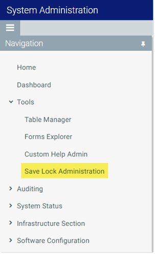 2. From the Navigation panel, select Tools > Save Lock Administration.