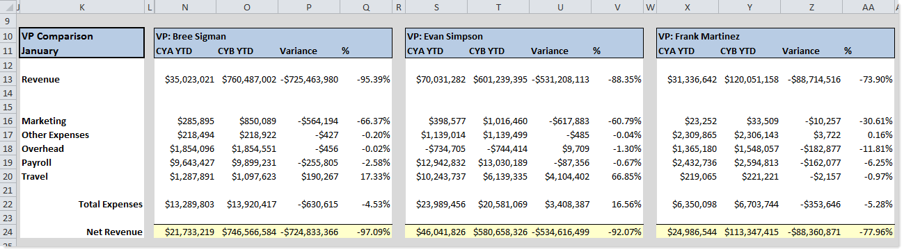The following screenshot shows an example with a horizontal Axiom query populating the VP names for the field definition row of a second, vertical Axiom query. Row 6 is the field definition row for the second query.