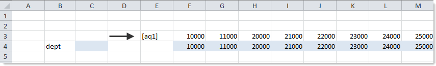 When the Axiom query is processed, data records are inserted after the cell marked with [aq#]. If the query is vertical, the records are inserted below the cell. If the query is horizontal, the records are inserted to the right of the cell.