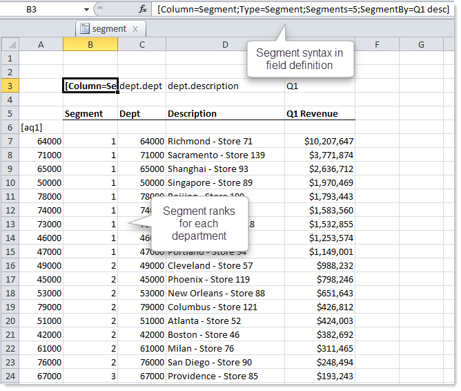 Segment=5. Alternatively, you can filter by segment using data range filters—for example, to have one data range per segment, such as[aq1; segment=5]. The Axiom query data filter and the sheet filters do not recognize the virtual column and cannot use it to filter results. -