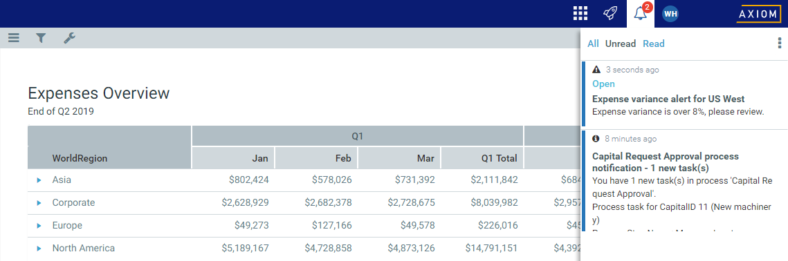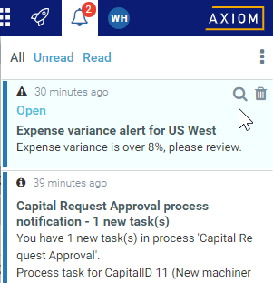 • Axiom system processes such as Process Plan Files. If you have triggered certain system processes, Axiom will notify you when the process is completed or when errors occur.