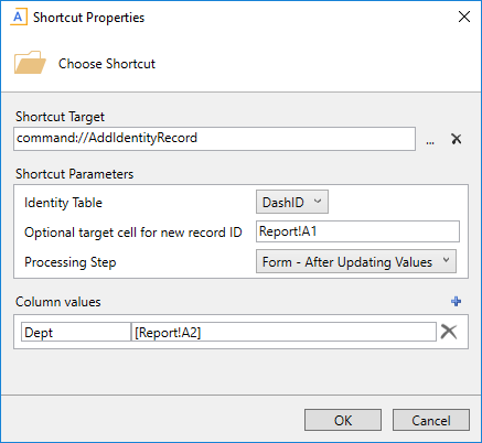 Example shortcut properties for Add Identity Record