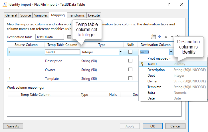 When mapping a temp table column to an Identity column in the destination table, the data type of the temp table column must be set to Integer. (If the identity column is Identity32, the temp table column should be set to Integer32.)