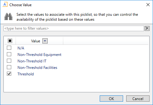 In the Choose Value dialog, select the values for which you want this variable to be enabled, and then click OK. This dialog displays all values in the picklist that the picklist enablement column looks up to.