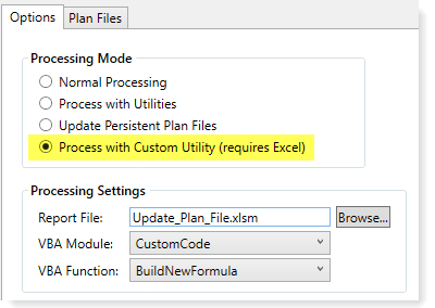 You can use the Process Plan Files feature to run a custom utility on plan files. The custom utility must be a Microsoft Excel spreadsheet that contains a VBA module with the custom code. This file must be saved within the Axiom file system, in the Reports Library.