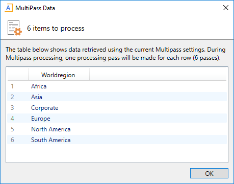You can check the list of items to be processed by clicking the Preview Multipass List button. The MultiPass Data dialog opens, displaying the total number of items to be processed, as well as the list of individual items. For example, if the source column is DEPT.WorldRegion and your organization is divided into six regions, then the preview returns six items to be processed, and shows you what those six items are.