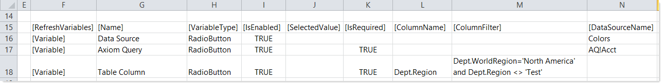 Unlike ComboBox variables, RadioButton refresh variables do not support use of associated RelatedColumnValue variables. This is because the kind of data displayed as radio buttons typically does not have related column values that need to be brought into the spreadsheet. Although ComboBox variables and RadioButton variables use the same data options, the kind of data they use is very different.