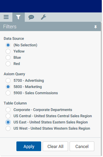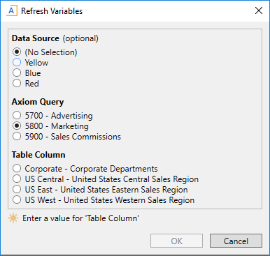 When the RadioButton variable is rendered in the refresh dialog or filter panel, the specified Axiom query is run in memory only (meaning, no values are populated within the sheet where the query is configured). The results of the query are used to generate the list of radio buttons.