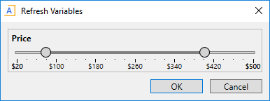 For example, you can use the range slider variable to prompt users to select the top and bottom values of a price range. The report can then be filtered to only bring in rows where the price falls within that range.