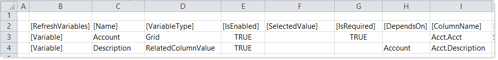 In this example, the RelatedColumnValue variable named Description depends on the Grid variable named Account. The Description variable is configured to return the value for Acct.Description based on the selected account for the Account variable.