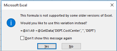 Use caution when developing Axiom spreadsheet files in Office 365 to ensure that you are not inadvertently introducing incompatible formulas. After entering a formula into Office 365, you may see a message informing you that the formula is incompatible and suggesting a compatible version. Always choose Yes when you see this prompt. Additionally, do NOT select the option Don’t show this message again, as this will prevent you from being prompted about incompatible formulas in the future.